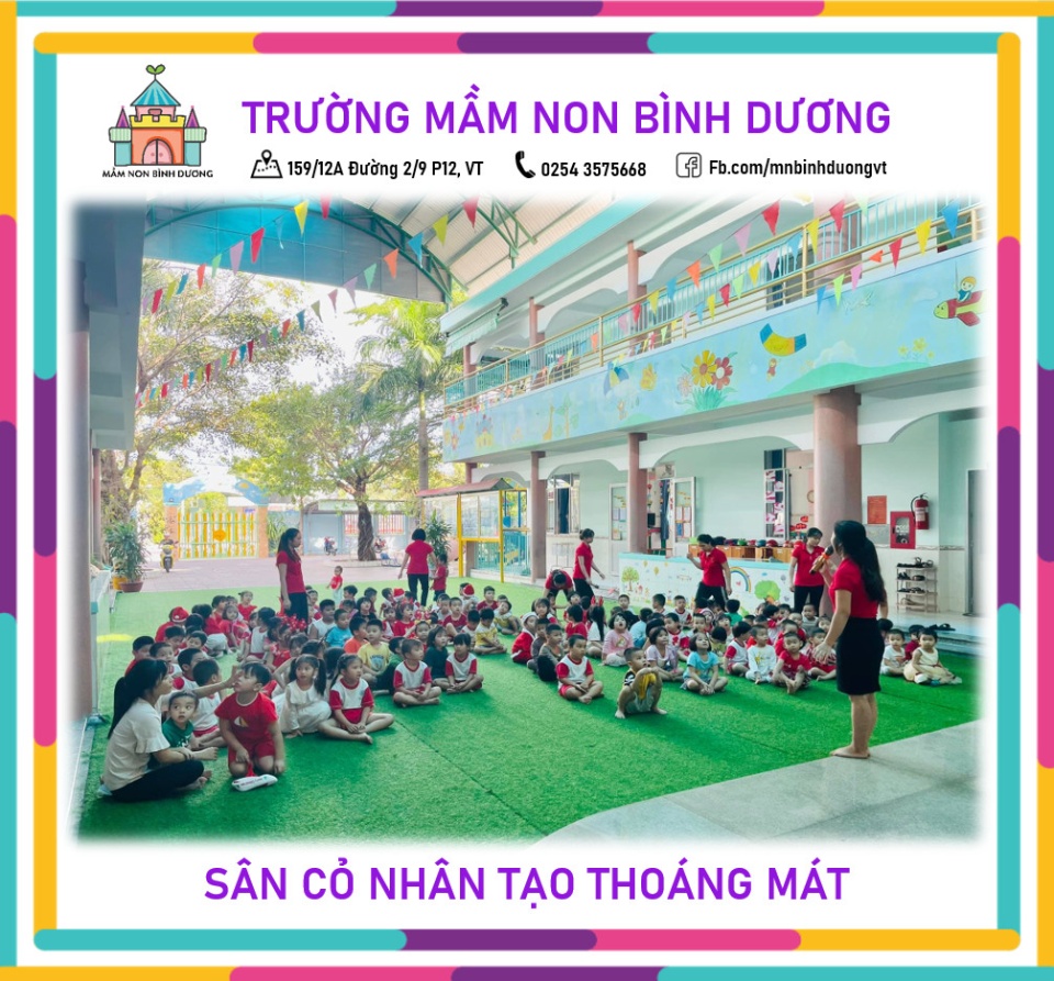 Trường Mầm non Bình Dương - Vũng Tàu có sân chơi rộng, khuôn viên thoáng mát, có sân cỏ nhân tạo giúp bé thoải mái chạy nhảy, vui chơi và học tập ngoài trời.